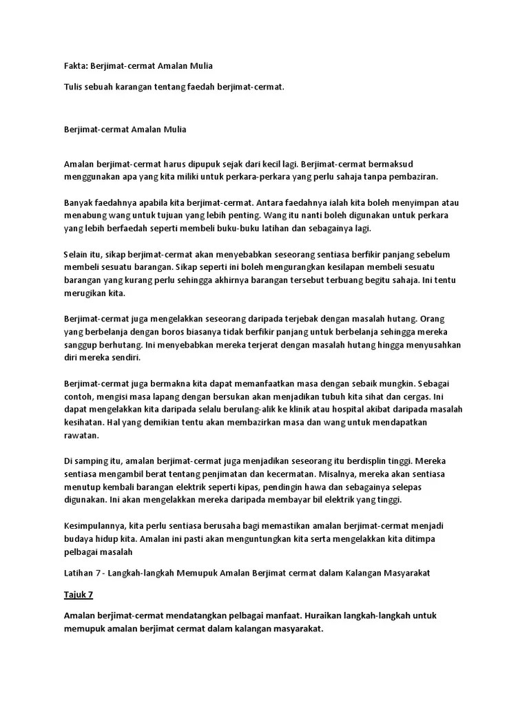 Check more flip ebooks related to nota komsas tingkatan 4 of norashidah_aris. Feb 12, 2016 · novel : Share nota komsas tingkatan 4 everywhere for free. Panjang karangan anda hendaklah antara 200 hingga 250 patah perkataan. Dengan adanya amalan ini, kita tidak akan boros dalam perbelanjaan seharian seperti makanan, hiburan dan sebagainya. Kita akan menggunakan wang dengan cermat dan memastikan kita tidak terlebih guna wang yana ada pada kita. Ibu bapa menunjukkan amalan berjimat cermat. Yaakub menunjukkan se….sangkar yang berisi dua…. Tema tersebut dijelmakan melalui watak zahar yang gigih menuntut ilmu dalam bidang pertukangan … Amalan menabung boleh menyemai tabiat berjimat cermat, terutamanya dalam kalangan pelajar. Dalam tempoh perintah kawalan pergerakan (pkp), ibu bapa seharusnya mengambil peluang keemasan ini dengan memupuk amalan berjimat cermat kerana kebanyakan ibu bapa bekerja dari rumah. Interested in flipbooks about nota komsas tingkatan 4? Tambahan pula, agama islam sendiri melarang umatnya bersikap boros lantaran pemboros ialah sahabat syaitan. Dalam meniti arus kemodenan yang berteraskan sains dan teknologi maklumat, faktor kesihatan masyarakat pada hari ini berada pada tahap yang membimbangkan pihak berkuasa …